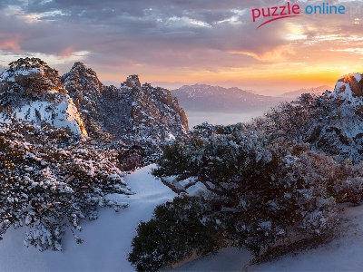 Park Narodowy Bukhansan, Drzewa, Mgła, Góra Dobongsan, Korea Południowa, Zima, Chmury, Roślinność, Góry, Skały, Wschód słońca