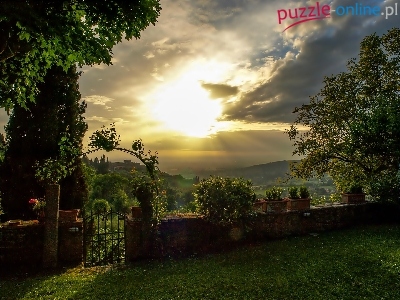 Ogród, Drzewa, Przebijające, Światło, Ogrodzenie