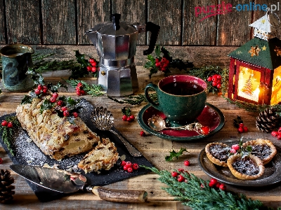 Świąteczna, Ciasteczka, Filiżanka, Lampion, Kawiarka, Kompozycja, Ciasto, Kawa