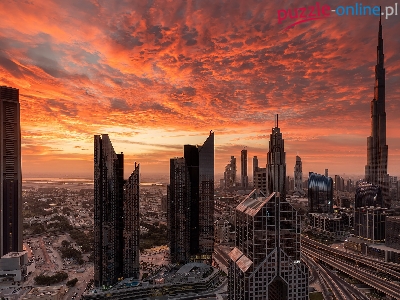 Dubaj, Zachód słońca, Chmury, Wieżowce, Zjednoczone Emiraty Arabskie, Drapacze chmur, Niebo
