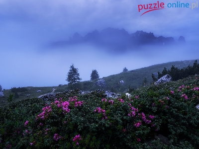 Dolina Val Gardena, Włochy, Góry, Różaneczniki, Drzewa, Mgła, Skały, Dolomity