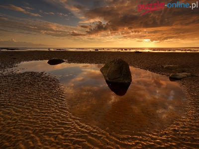Kamienie, Brzeg, Zachód słońca, Morze, Plaża, Kałuża