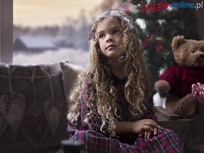 Blondynka, Miś, Kraciasta, Długie, Włosy, Dziewczynka, Kręcone, Sukienka