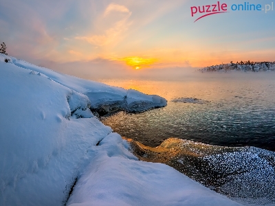 Jezioro Ładoga, Drzewa, Rosja, Wschód słońca, Zima, Mgła, Karelia