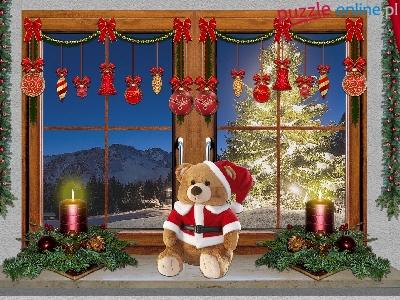 Świeczki, Parapet, Bombki, Okno, 2D, Miś, Stroiki, Boże Narodzenie, Dekoracja, Girlandy