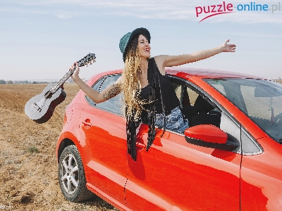 Blondynka, Radość, Samochód, Kapelusz, Czerwony, Kobieta, Gitara, Pole