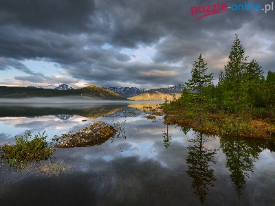 Odbicie, Kołyma, Rosja, Jezioro Jack London, Góry Kołymskie, Drzewa, Obwód magadański