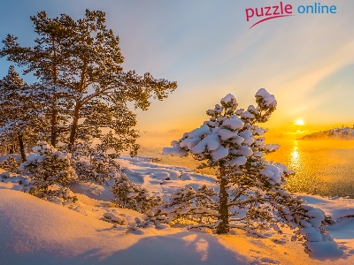 Jezioro Ładoga, Rosja, Wschód słońca, Ośnieżone, Mgła, Zima, Drzewa, Republika Karelii