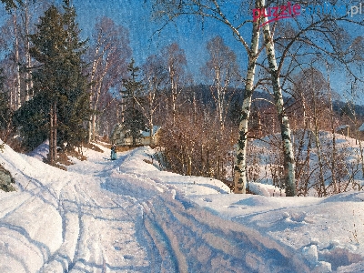 Malarz, Zima, Droga, Duński, Domy, Malarstwo, Drzewa, Wiejska, Obraz, Peder Mork Monsted, Staruszka