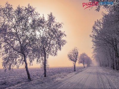 Śnieg, Pola, Mgła, Drzewa, Zima, Droga, Szron
