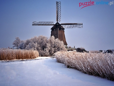 Drzewa, Zima, Wiatrak, Rzeka, Szuwary