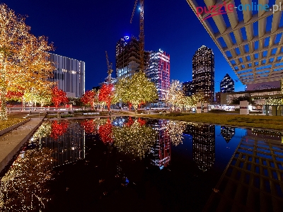 Teksas, Dallas, Sadzawka, Oświetlone, Noc, Wieżowce, Miasto nocą, Stany Zjednoczone, Drzewa