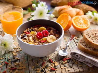 Szklanka, Miseczka, Śniadanie, Pomarańcze, Sok, Chleb, Musli