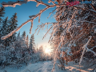 Promienie słońca, Gałęzie, Zima, Las, Drzewa