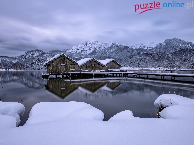 Jezioro, Zima, Góry, Drewniane, Pomost, Zima, Domki, Śnieg