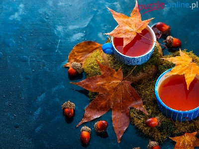 Liście, Niebieskie, Mech, Herbata, Filiżanki, Żołędzie
