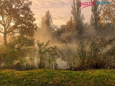 Mgła, Trawa, Liście, Drzewa, Rzeka, Świt, Trzciny