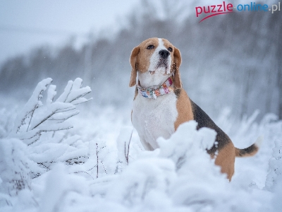 Zima, Rośliny, Pies, Beagle, Ośnieżone