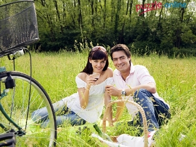 Piknik, Rower, Kobieta, Mężczyzna, Łąka
