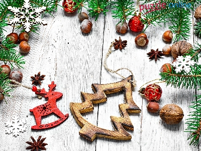 Ozdoby, Gwiazdki, Orzechy, Drewniana, Gałązki, Boże Narodzenie, Choinka, Renifer