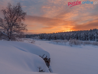 Rzeka Peczora, Zaśnieżona, Zachód słońca, Chmury, Rosja, Las, Zima, Drzewa, Republika Komi