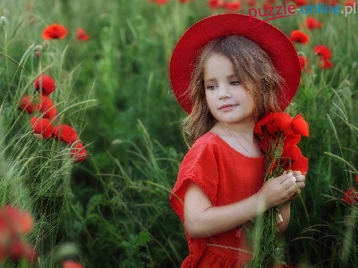 Kwiaty, Czerwony, Trawa, Dziewczynka, Kapelusz, Maki