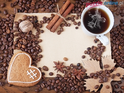 Kawa, Liść, Pierniczek, Ziarna, Orzech, Filiżanka, Cynamon, Serce