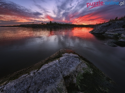 Skały, Zachód słońca, Rosja, Chmury, Jezioro Ładoga, Drzewa, Karelia