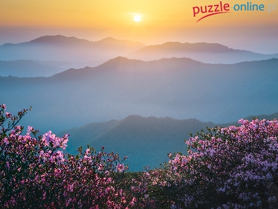 Wschód słońca, Kwiaty, Różaneczniki, Różowe, Góry, Mgła, Krzewy