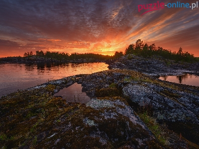 Zachód słońca, Drzewa, Rosja, Jezioro Ładoga, Skały, Karelia