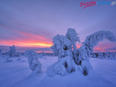 Zima, Finlandia, Wzgórze, Drzewa, Wschód słońca, Rezerwat Valtavaara, Mgła, Laponia