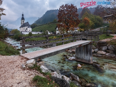 Ramsau bei Berchtesgaden, Niemcy, Most, Góry Alpy, Rzeka Ramsauer Ache, Park Narodowy Berchtesgaden, Kościół św. Sebastiana, Bawaria