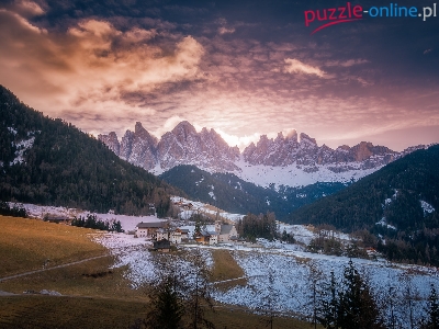 Santa Maddalena, Wieś, Dolina Val di Funes, Zima, Domy, Dolomity, Włochy, Góry, Lasy