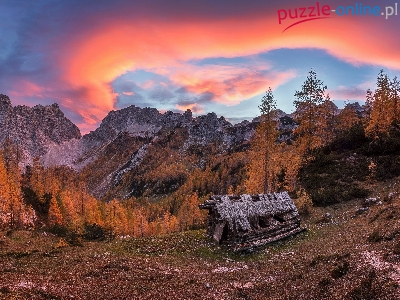 Góry, Zachód słońca, Zniszczona, Alpy Julijskie, Drewniana, Jesień, Drzewa, Szopa