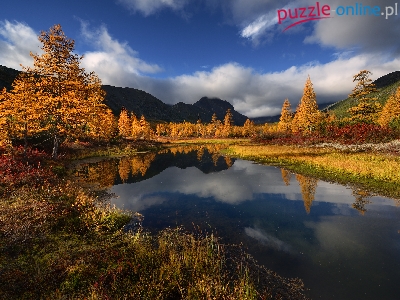 Potok Nieznany, Rzeka, Chmury, Kołyma, Rosja, Jesień, Góry Kołymskie, Drzewa, Obwód magadański