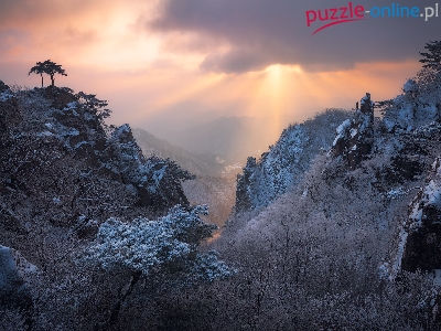 Góry, Korea Południowa, Park prowincjonalny Daedunsan, Mgła, Przebijające światło, Zima, Drzewa, Jeolla Północna