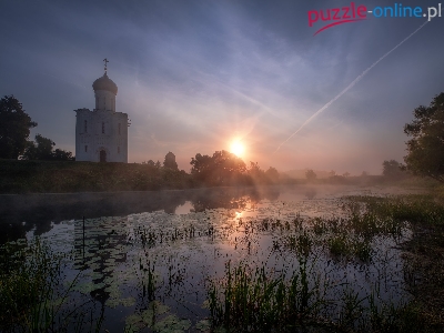 Cerkiew Opieki Matki Bożej, Brzeg, Wschód słońca, Bogolubowo, Rosja, Szuwary, Rzeka Nerl, Drzewa, Obwód włodzimierski