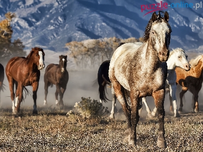 Puzzle Drzewa, Konie, Góry, Trawa