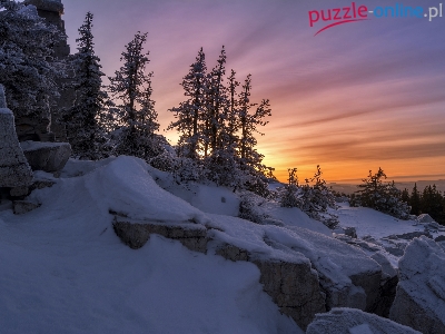 Skały, Rosja, Park Narodowy Ziuratkul, Śnieg, Zachód słońca, Zima, Drzewa, Obwód czelabiński