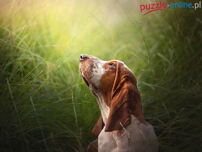 Uniesiona, Trawa, Pies, Basset hound, Głowa