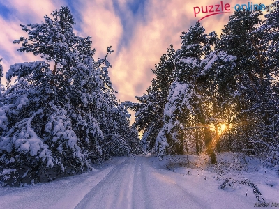 Las, Chmury, Zaśnieżona, Ośnieżone, Przebijające światło, Zima, Drzewa, Droga
