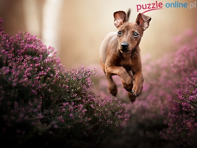 Puzzle Kwiaty, Biegnący, Pies, Wrzosy