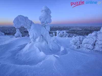Drzewa, Finlandia, Rezerwat Valtavaara, Mgła, Wzgórze,  Zima, Wschód słońca, Laponia