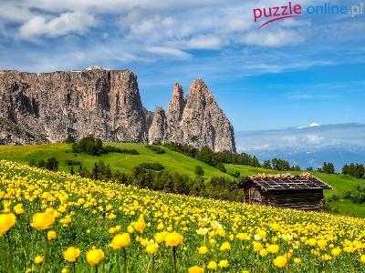 Dolomity, Góry, Szopa, Łąka, Kwiaty, Drewniana, Włochy, Góra Schlern, Żółte