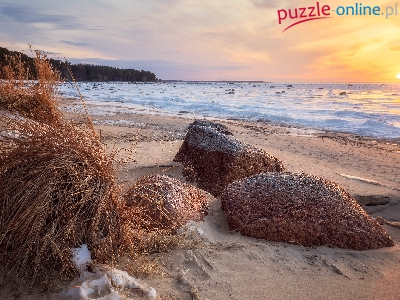 Trawa, Wschód słońca, Morze, Plaża, Kamienie