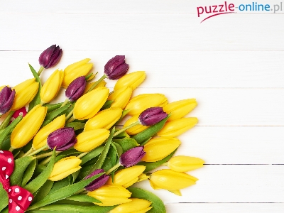 Tulipany, Wstążka, Żółte, Bordowe, Bukiet