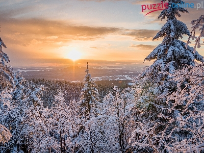 Las, Góry, Chmury, Zima, Drzewa, Wschód słońca