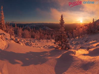 Góry, Drzewa, Chmury, Ośnieżone, Zima, Las, Wschód słońca