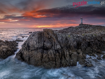 Zachód Słońca, Skała, Hiszpania, Morze, Latarnia morska Cabo Roncudo, Prowincja A Coruna
