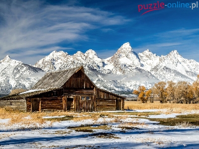 Chata, Stany Zjednoczone, Park Narodowy Grand Teton, Góry Teton Range, Drzewa, Drewniana, Śnieg, Stan Wyoming